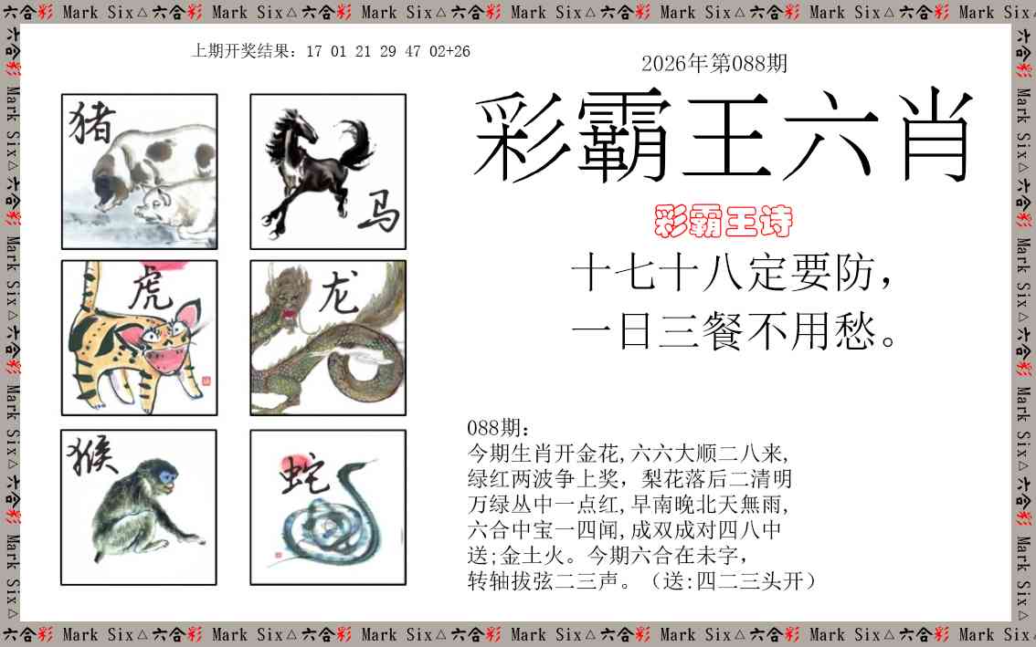 087期 单【猴龙虎鼠】 双【兔蛇羊猪】 开蛇26准